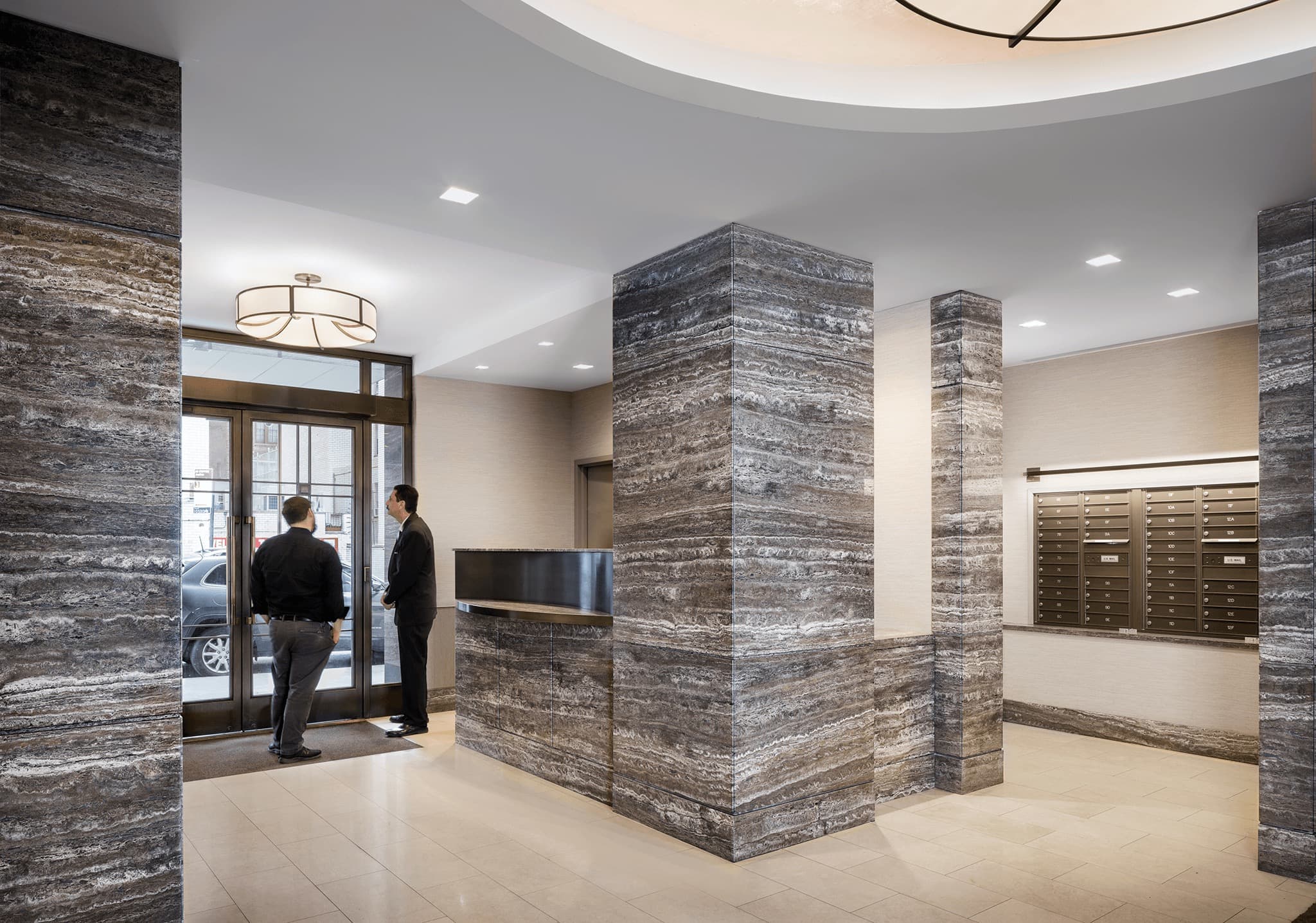 We took advantage of underutilized storage space, hung ceiling space and a challenging floor level change to create a visually open, elegant and well-crafted entry sequence. Together with a seamlessly integrated state of the art security, package delivery and HVAC systems the Board of Directors have enhanced the value of the property for its Shareholders for years to come.
