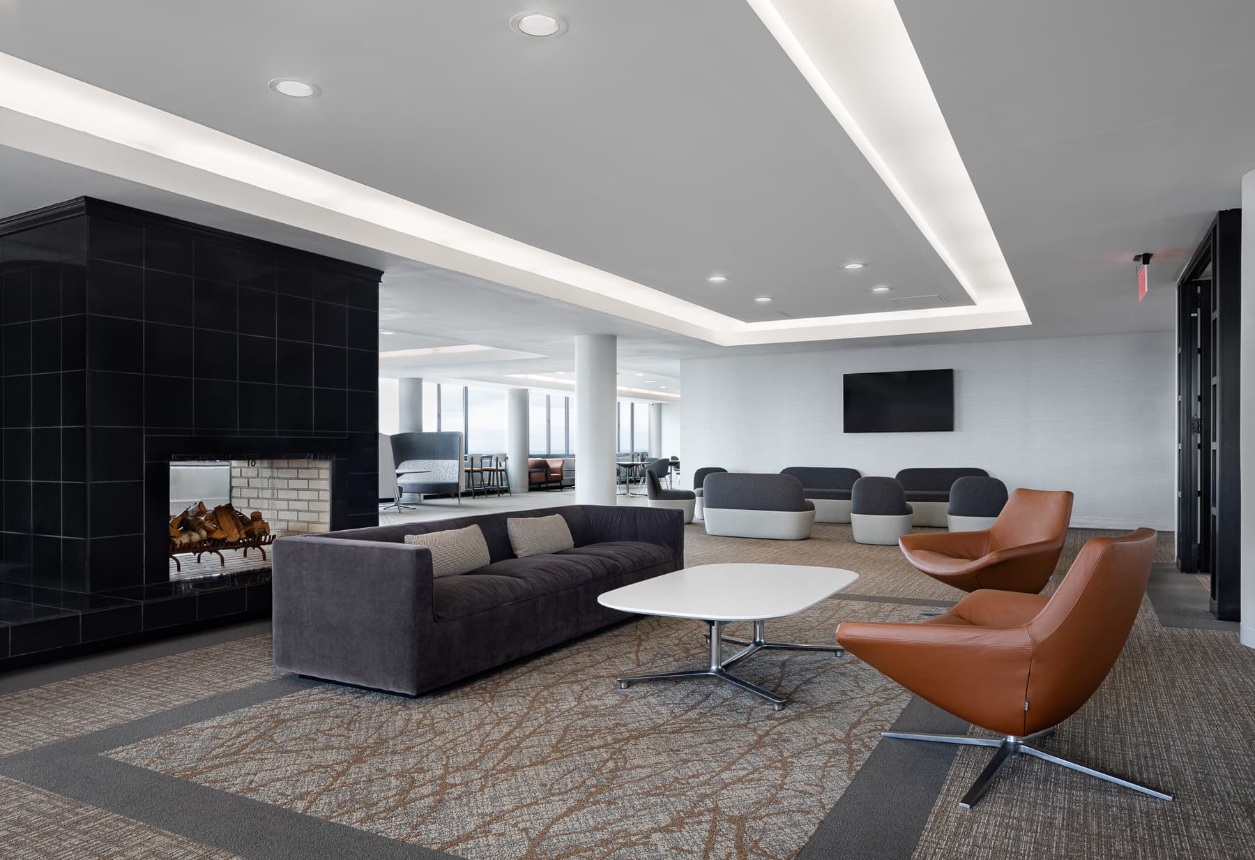 The improvements are palpable as soon as you step off the elevator. We modernized all spaces with a new cooler color scheme and higher quality finishes which speak perfectly to the surrounding views. A woven durable vinyl wallcovering brings a bit of shimmer and a new solution-dyed nylon carpet with accent borders and complementary inset rugs add interest and help to break up the otherwise undefined immensity. In fitness areas, plain resilient flooring was replaced with resilient faux wood to bring in some warmth as well as better acoustical value. There are a multitude of styles of furniture and seating used throughout to create multifunctional spaces. They range from lounge chairs with acoustical properties for privacy, desks and stools, to booths and lightweight ottomans and sofas. We worked closely with the client to ensure that all furniture is coordinated so it can easily be moved around to meet the needs of the residents for daily use as well as special events like small intimate gatherings or parties of 50+, all while still looking cohesive.